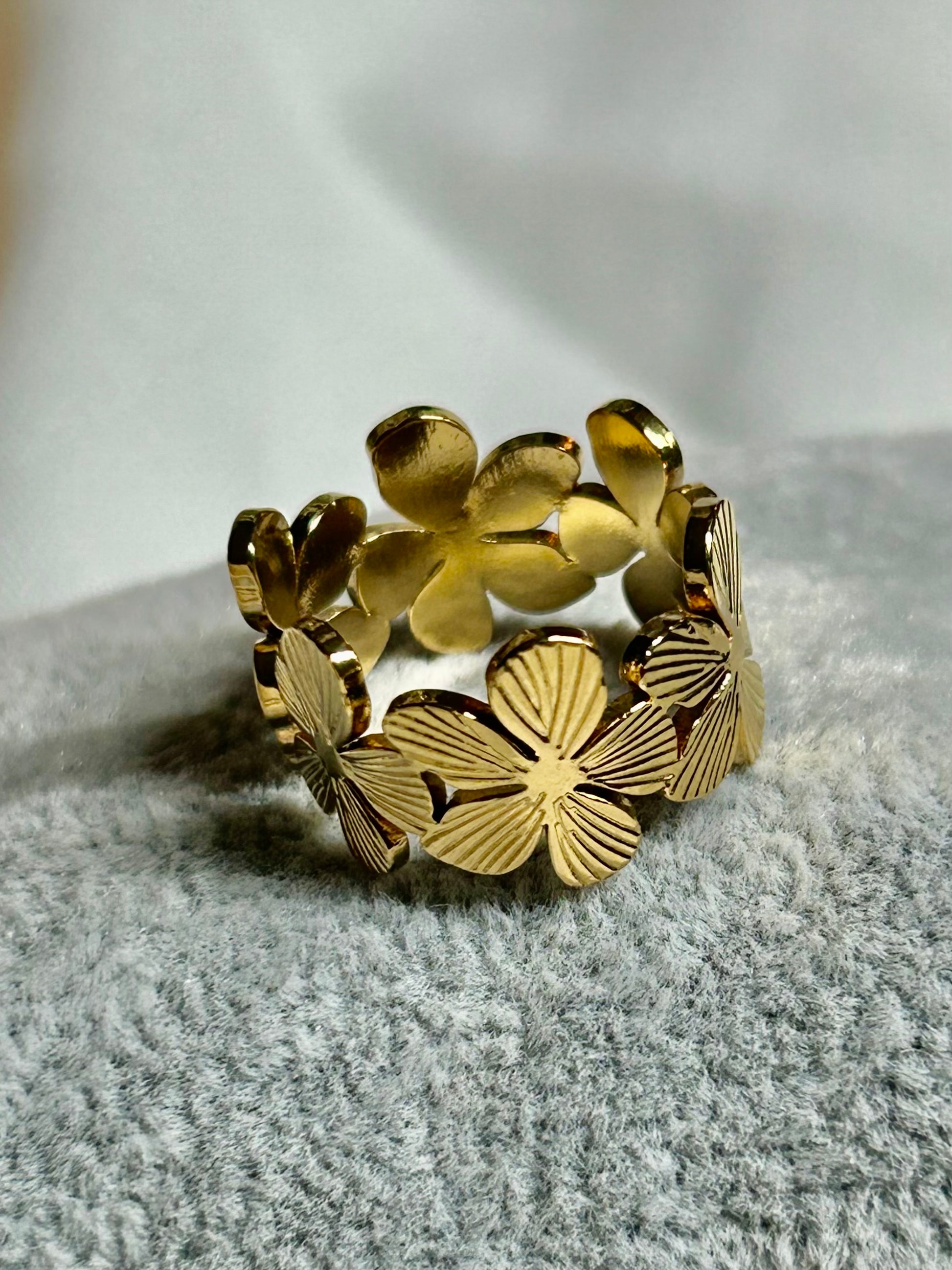 Un jardin à fleur de doigt. La bague Aneya unit élégance dorée et délicatesse florale. Ses pétales texturés captent la lumière avec grâce — un bijou qui respire la poésie.