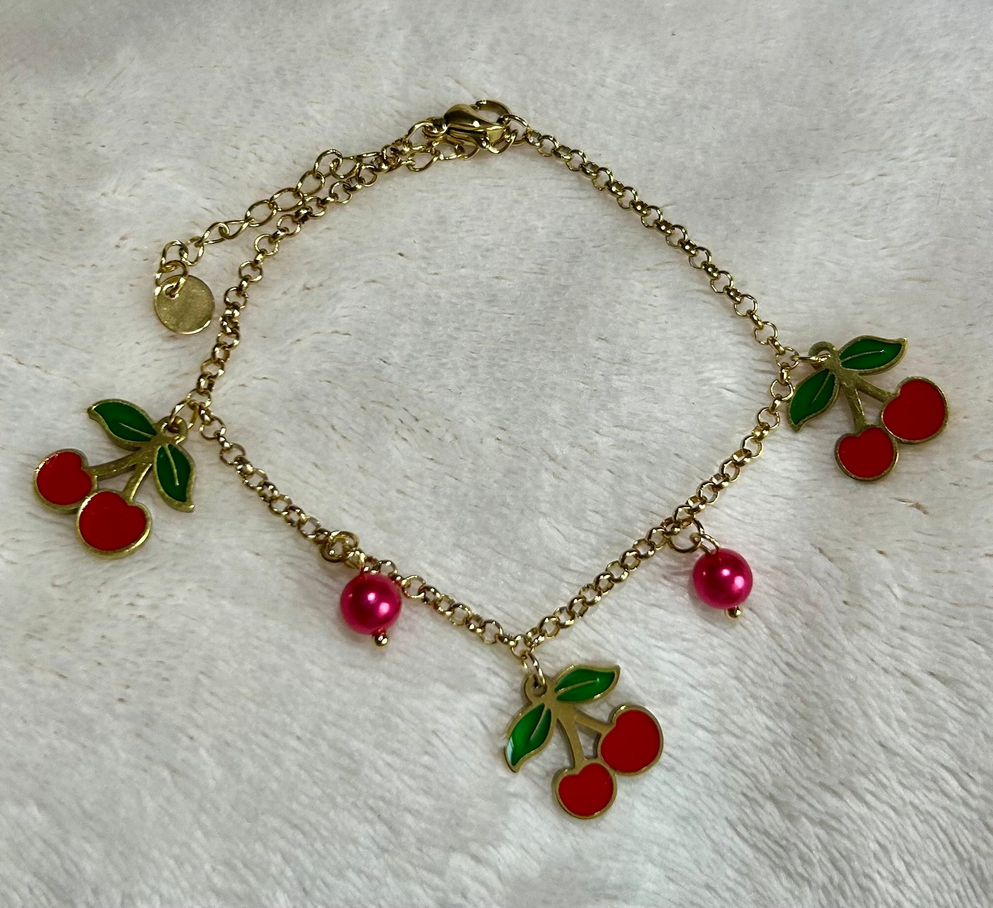 Un bijou fun et fruité ! Ce bracelet doré s’illumine de charms cerises rouges émaillées et de perles roses éclatantes. Parfait pour une touche pop et estivale.