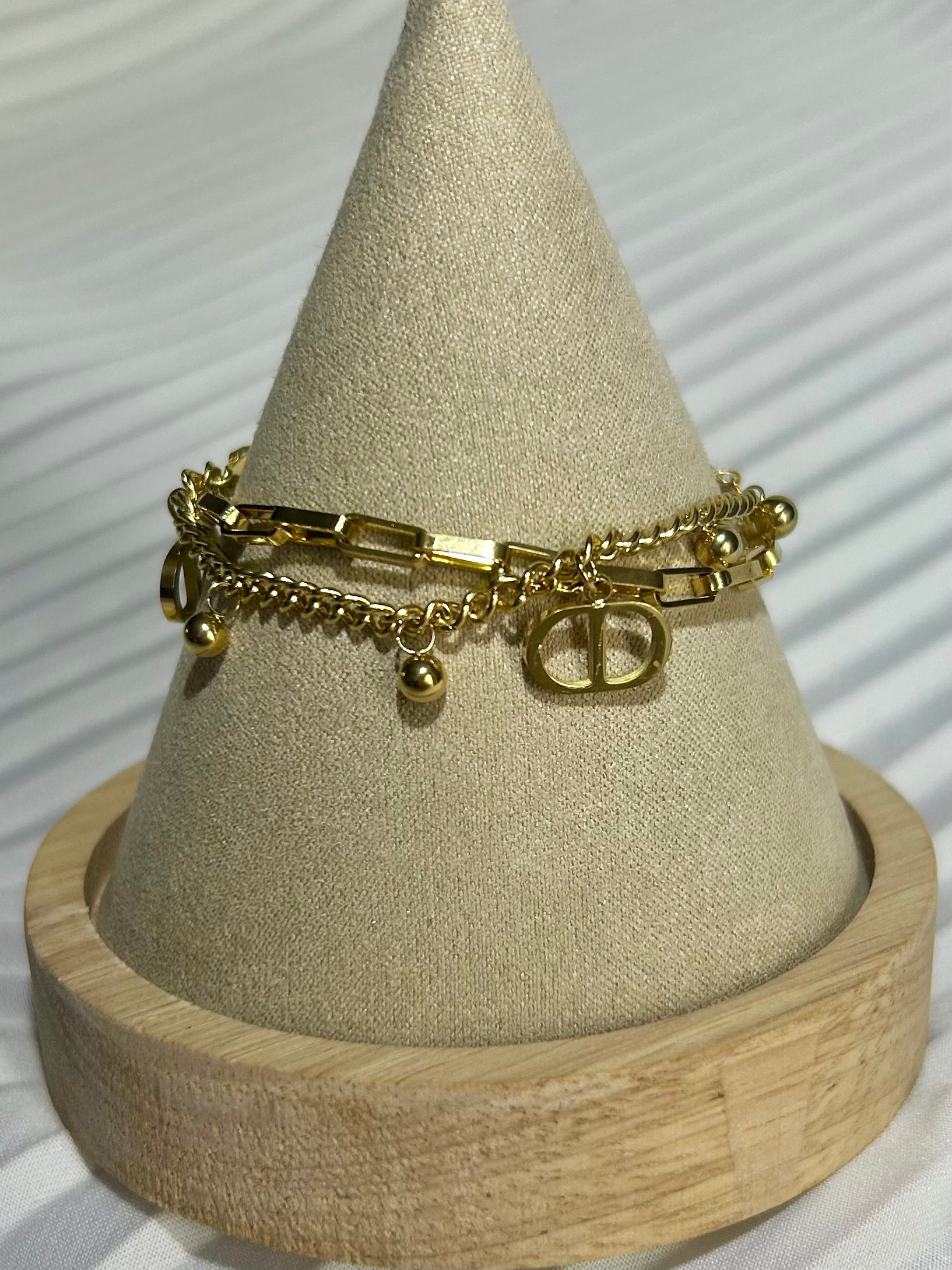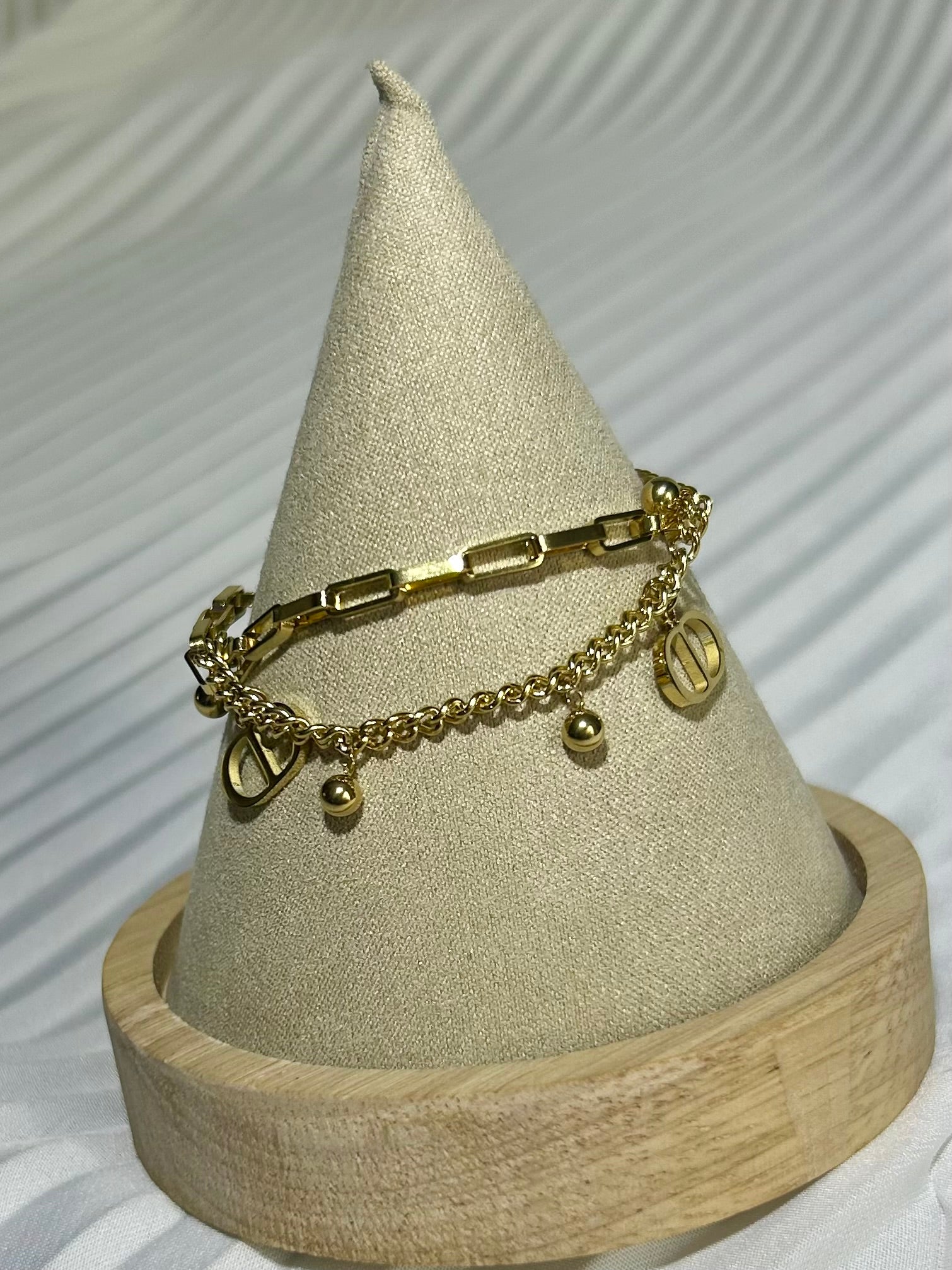Le bracelet Charms Deva joue l’accumulation avec style. Il mêle maillons larges, fine chaîne boule et pampilles dorées pour un effet chic et audacieux. Son maillon central ovale et ajouré attire le regard, apportant une touche moderne et tendance. Un bijou lumineux qui se suffit à lui-même !