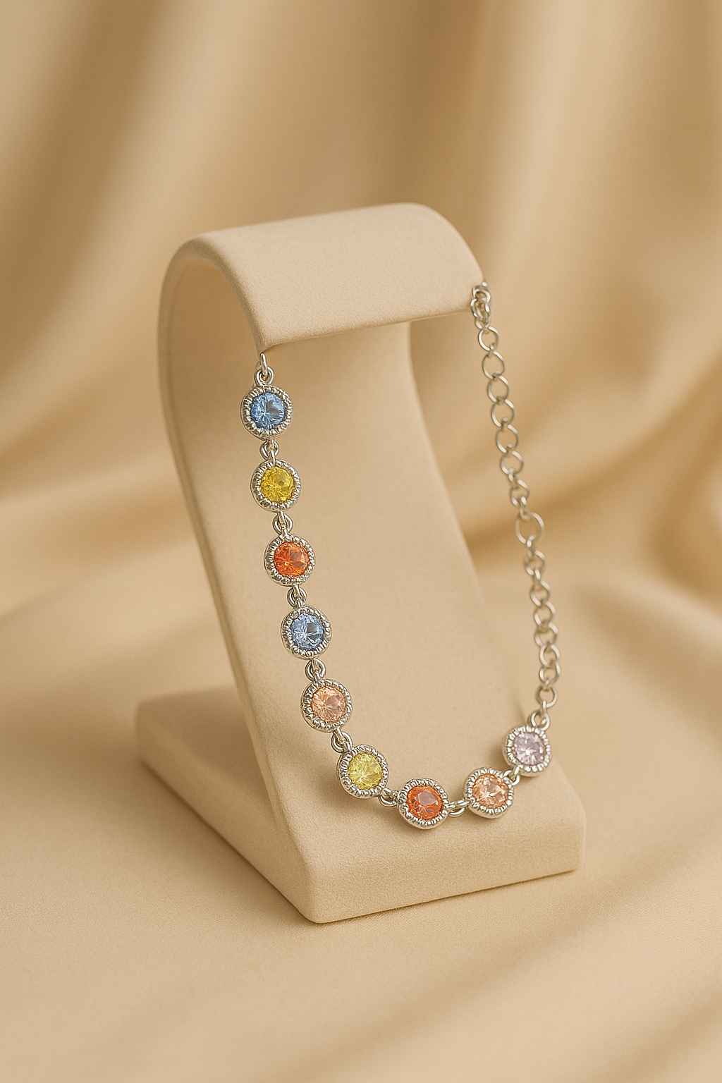 Ce bijou illuminé de zirconiums multicolores mêle finesse et bonne humeur. Chaque pierre est finement sertie dans un contour texturé argenté pour un rendu éclatant, joyeux et délicat.