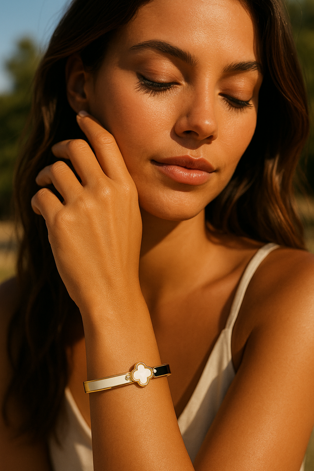 Élégance et contraste s’unissent dans ce bracelet rigide doré, orné d’une fleur nacrée en son centre. Son design bicolore noir et blanc, rehaussé de deux strass scintillants, en fait un bijou chic et raffiné, idéal pour sublimer toutes vos tenues.