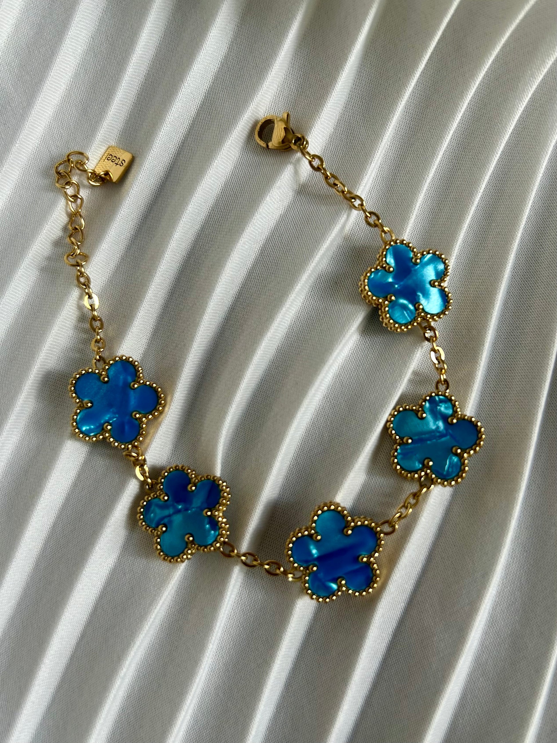 Ce bracelet délicat se compose de trèfles à cinq pétales sertis de doré, espacés sur une fine chaîne brillante. Un bijou élégant qui sublime le poignet avec légèreté.