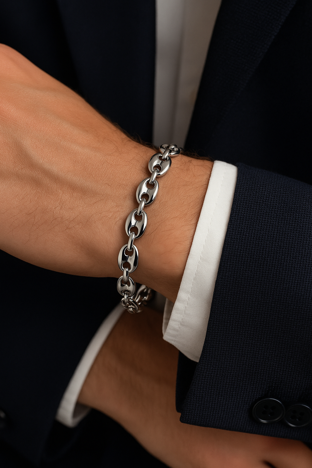 Un classique intemporel revisité en acier inoxydable. Ce bracelet à maillons grain de café argenté affirme un style masculin et affirmé, parfait pour un look moderne ou plus habillé.