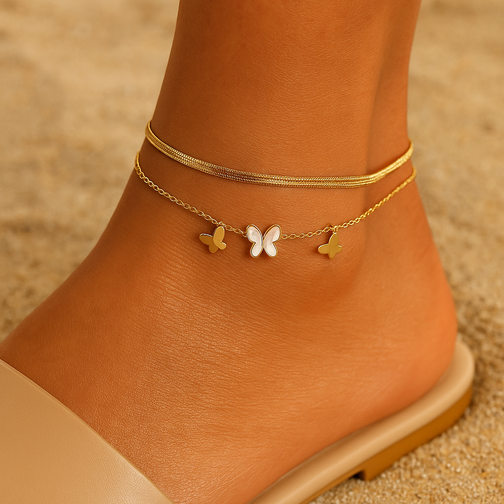 Délicate et raffinée, la chaîne de cheville papillon marie deux styles de chaînes dorées : une fine maille serpent et une maille classique ornée de trois breloques papillon. Au centre, un papillon nacré capte la lumière, entouré de deux papillons dorés élégants. Un bijou féminin et aérien, parfait pour sublimer vos chevilles cet été.