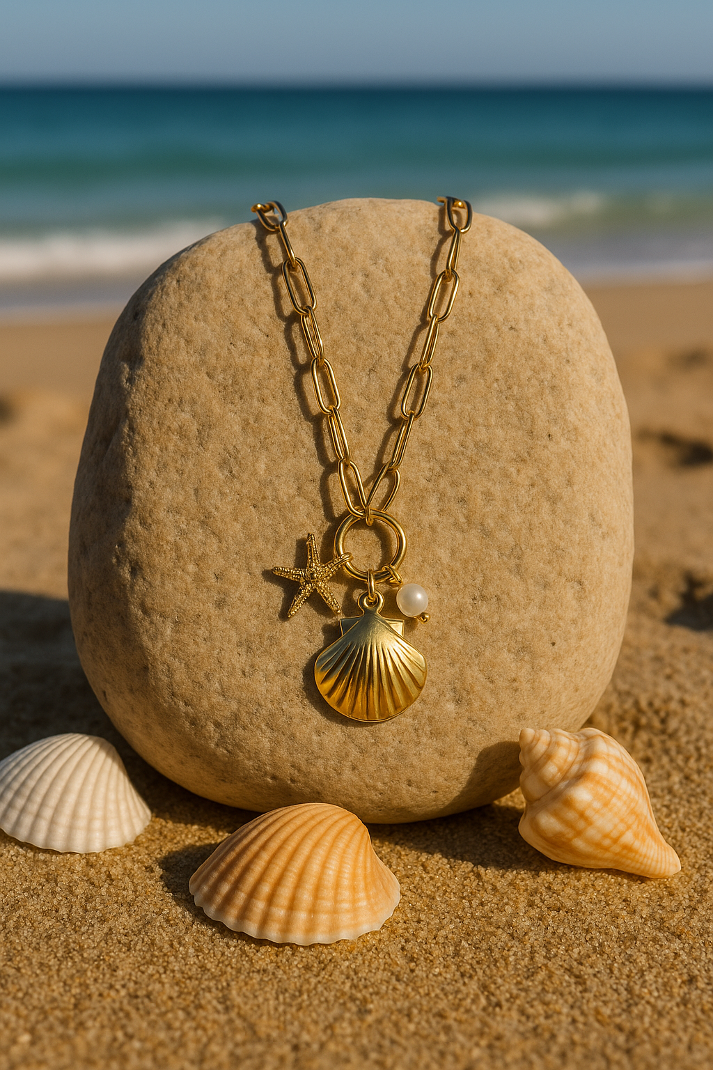 Prado, l’élégance dorée aux airs marins : un collier à maillons rehaussé d’un coquillage, d’une étoile de mer et d’une perle pour un look solaire et raffiné.