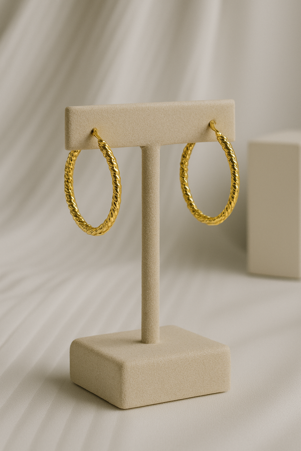 Des créoles dorées en acier inoxydable au motif discret et lumineux, parfaites pour sublimer chaque tenue. Légères, modernes, et intemporelles 🌟