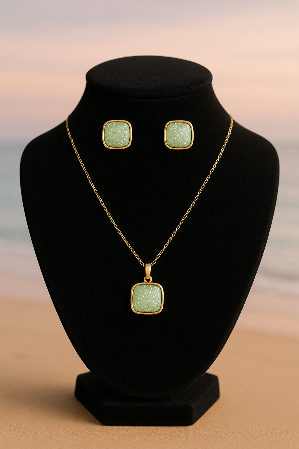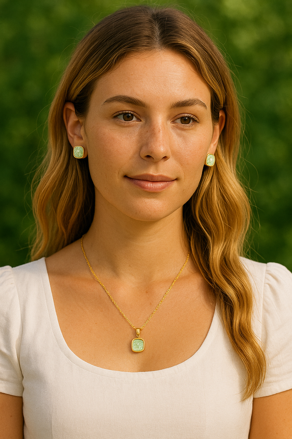 Parure élégante en pierres druzy vert pâle scintillantes, montée sur doré fin, portée sur une robe blanche dans un décor naturel lumineux. Un pendentif discret et des boucles assorties qui ajoutent une touche chic et lumineuse à votre style.