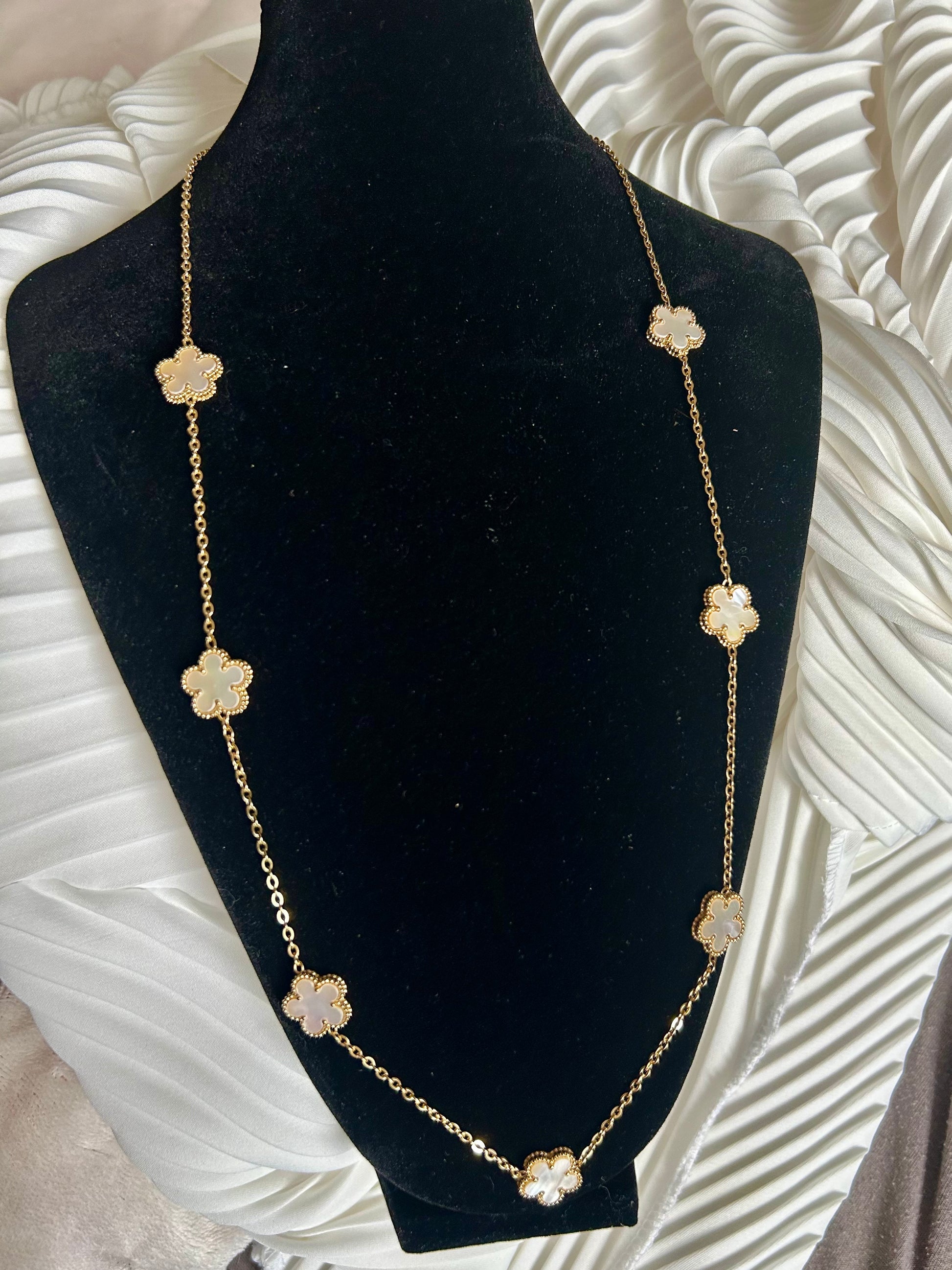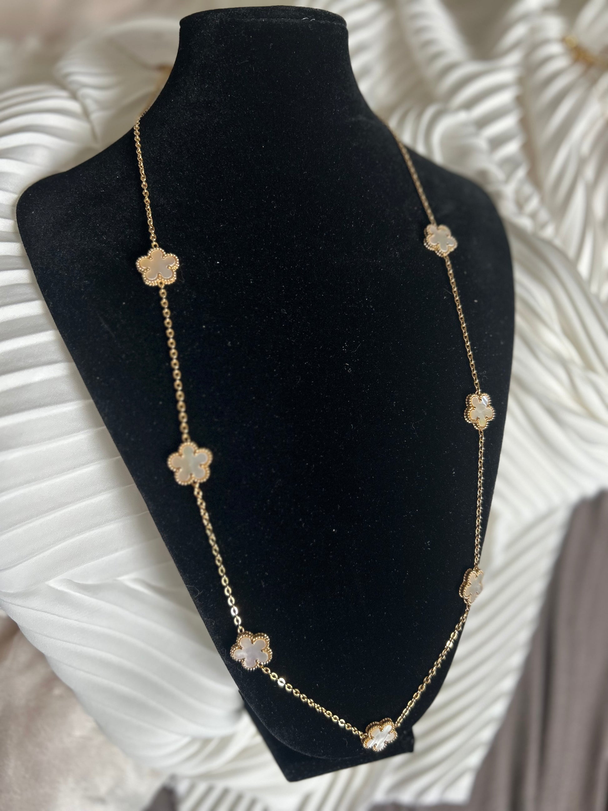 Ce sautoir délicat met en valeur des fleurs blanches subtilement espacées le long d’une chaîne dorée Un bijou intemporel, féminin et plein de douceur.