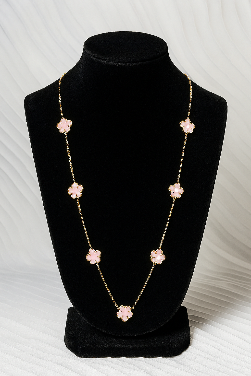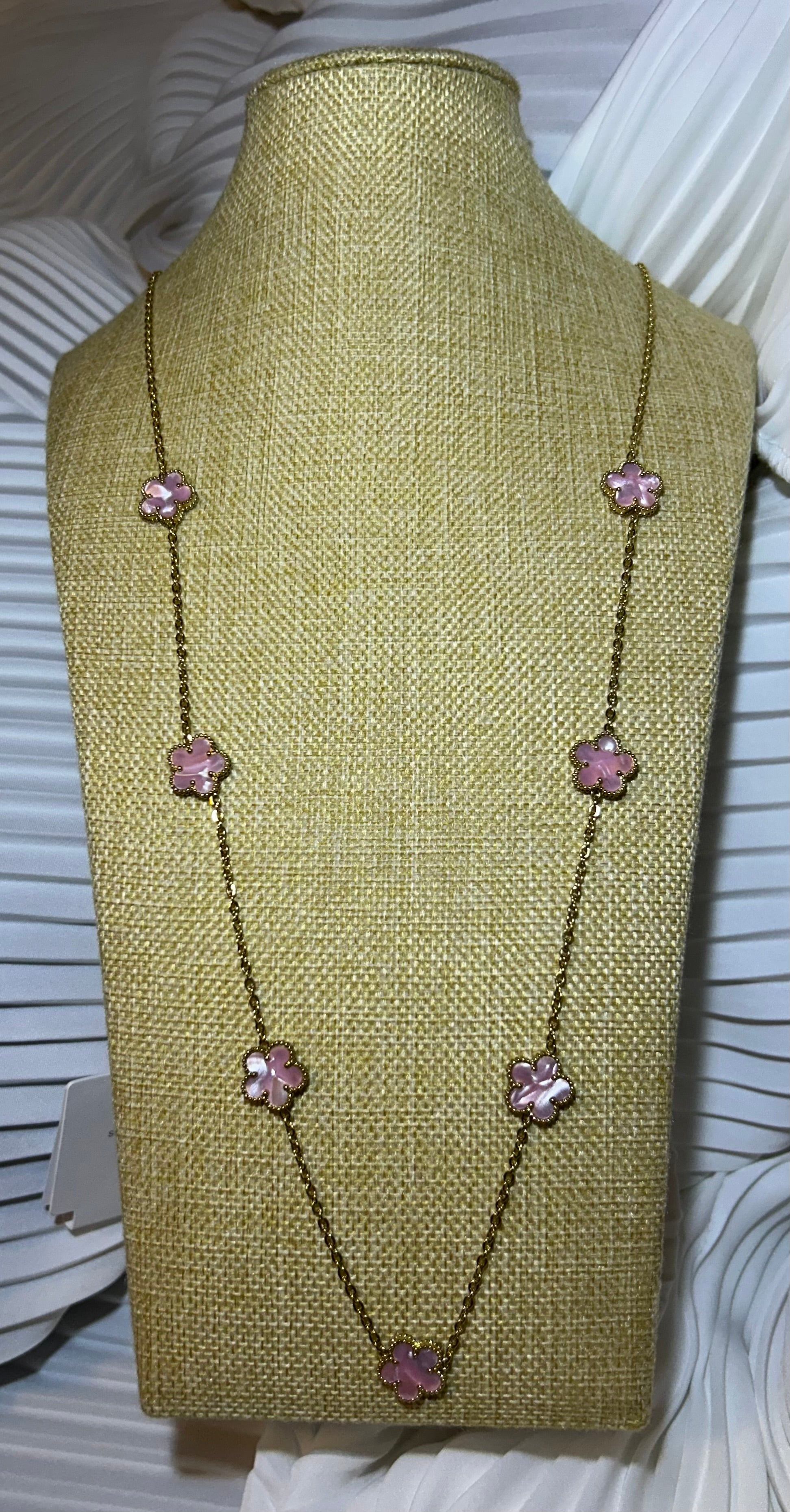 Élégant et lumineux, le sautoir Floréa rose sublime votre décolleté avec ses délicates fleurs à cinq pétales en nacre rose, montées sur une fine chaîne dorée en acier inoxydable.