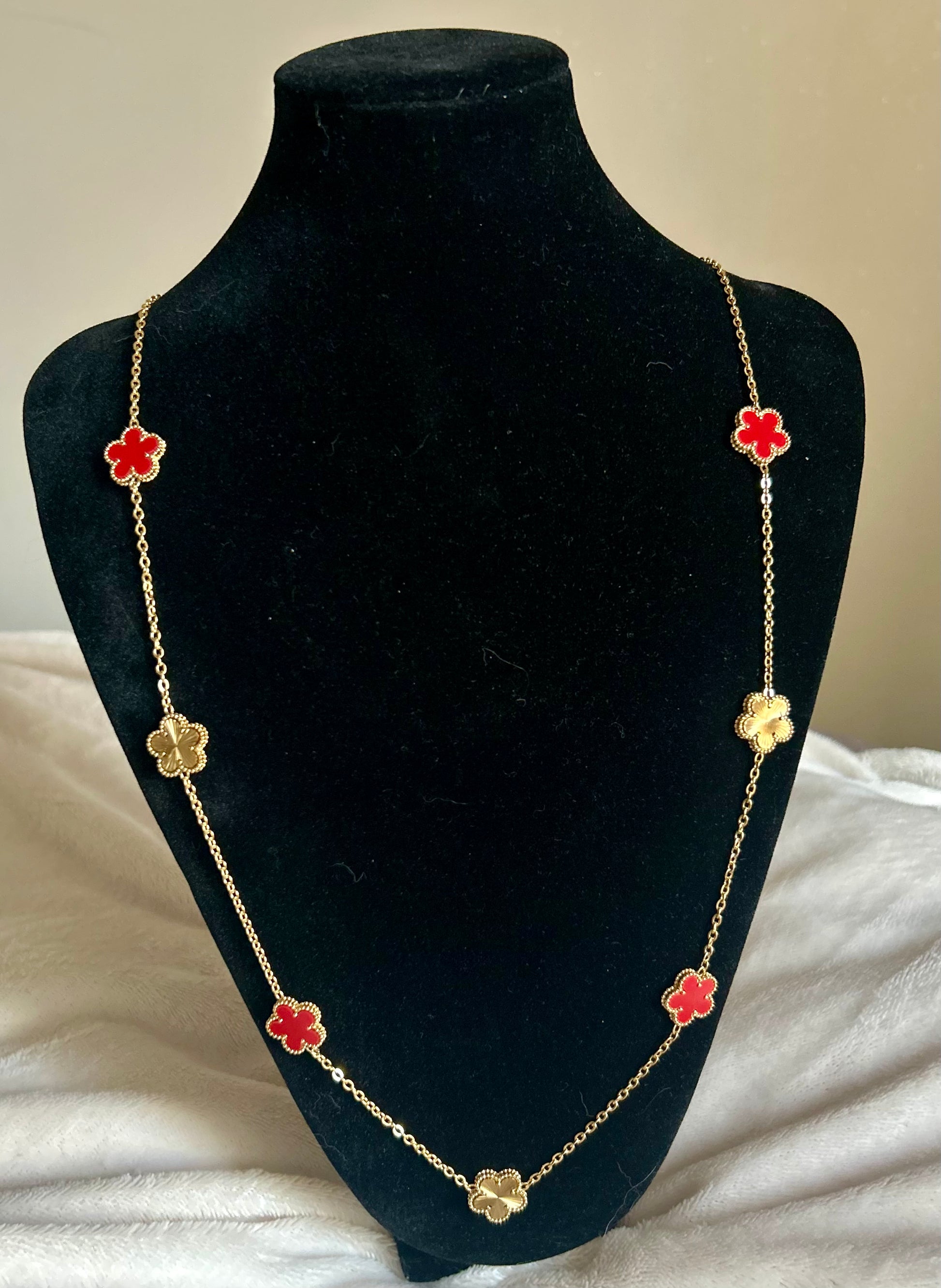 Un sautoir raffiné orné d’un délicat mélange de fleurs rouges éclatantes et dorées lumineuses, pour une touche florale chic et intemporelle.