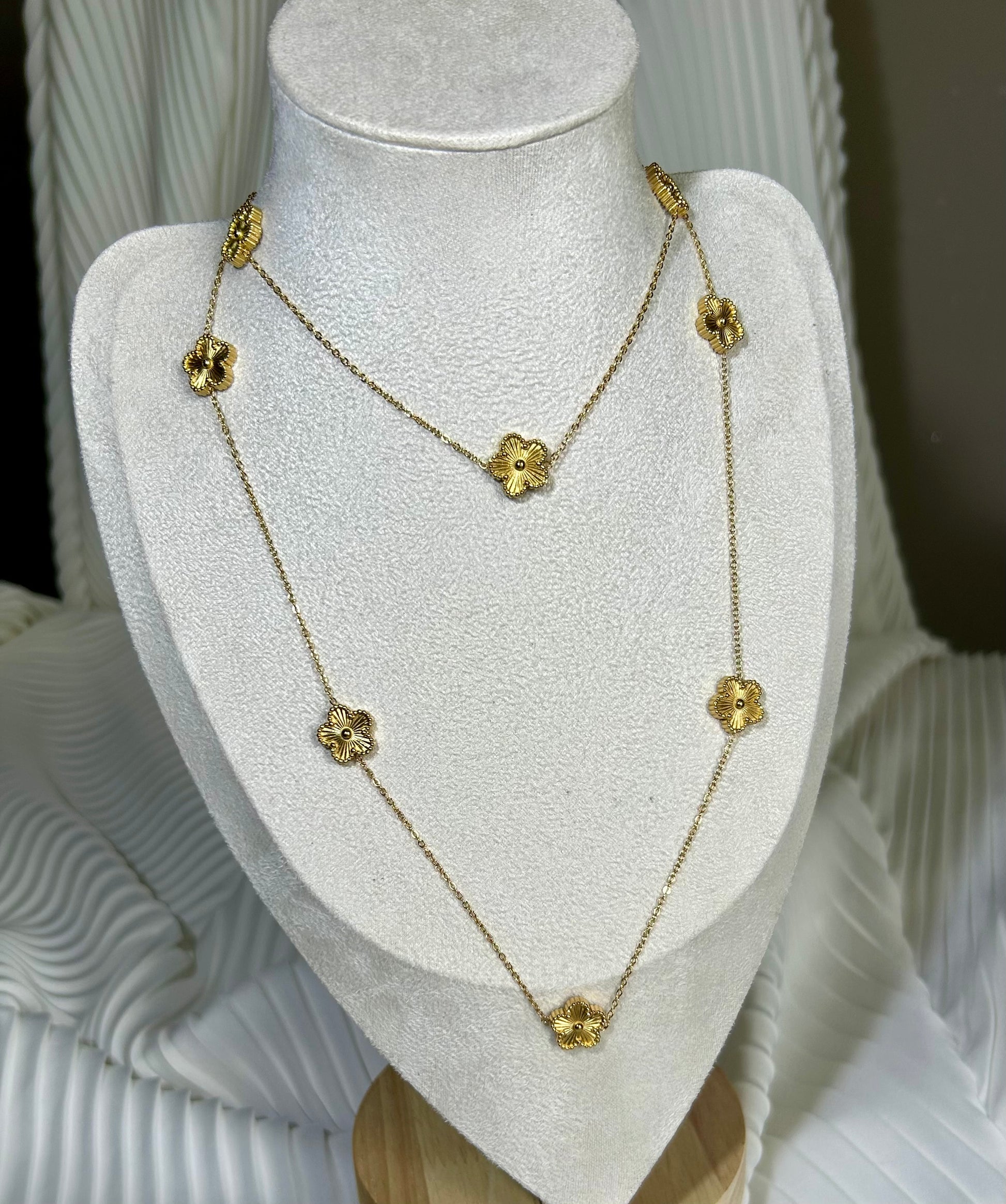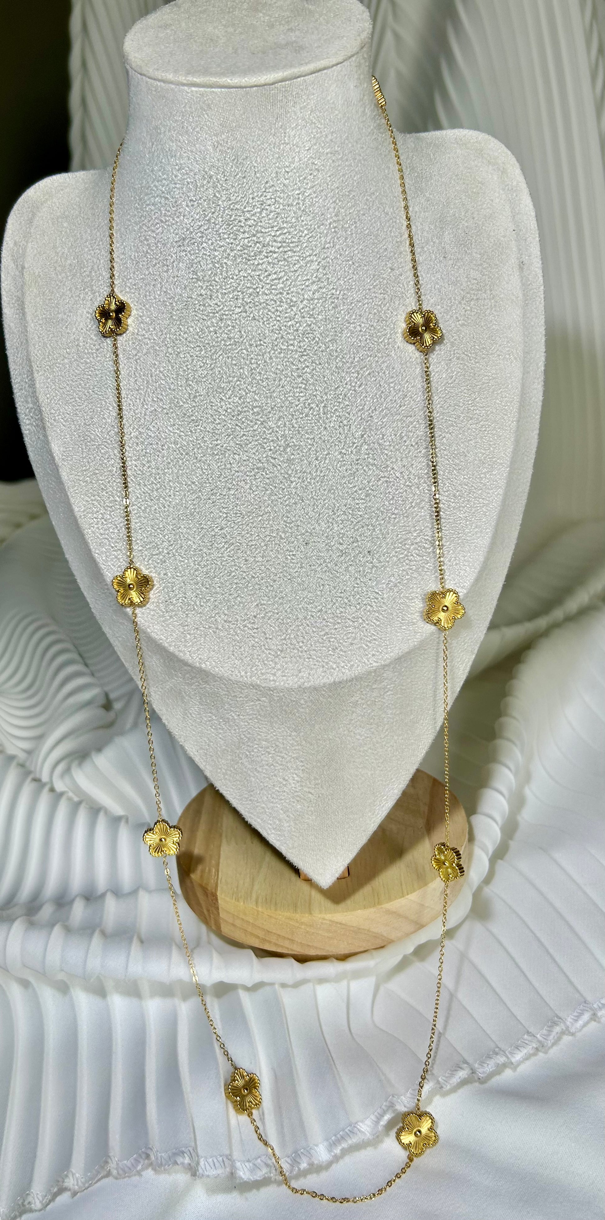 Ce sautoir délicat met en valeur des fleurs dorées subtilement espacées le long d’une chaîne dorée Un bijou intemporel, féminin et plein de douceur.